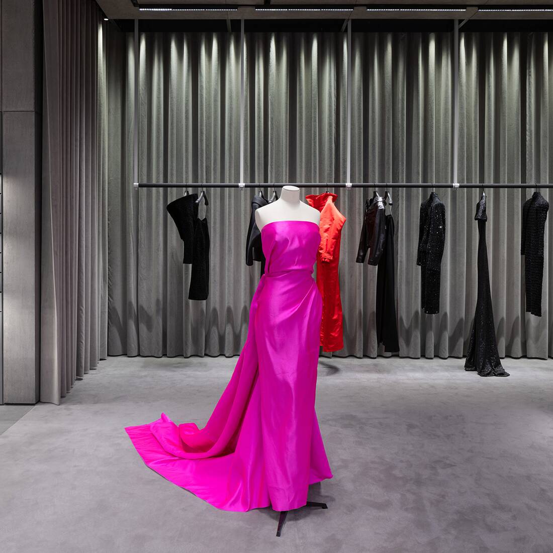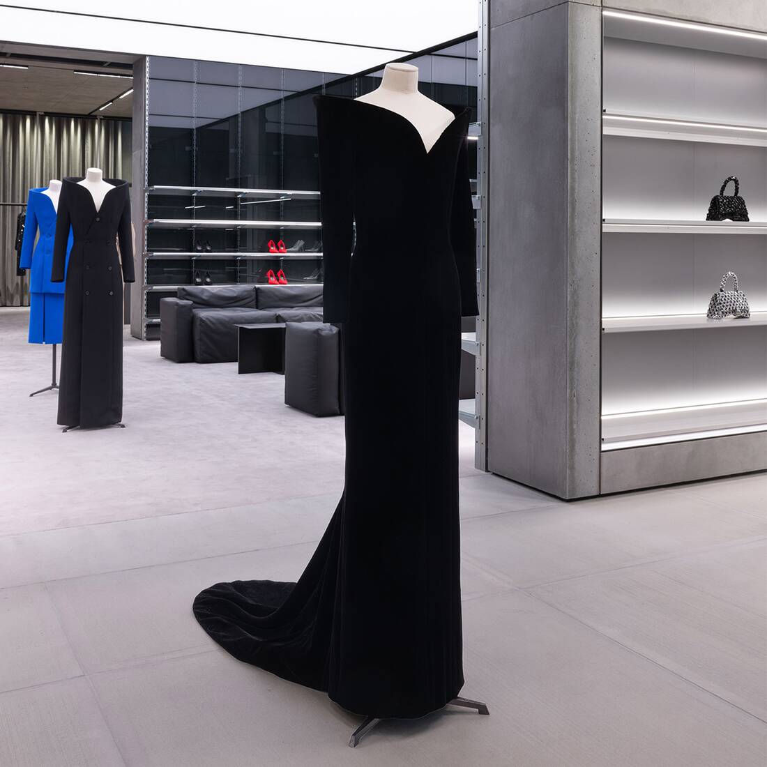 On February 14th, 2024, Balenciaga opened a new store in Dubai, the biggest in the Middle East region, on the first floor Luxury Rotonda of Mall of the Emirates’ Fashion Dome. The store’s 500 square meters space offers the latest Balenciaga men’s and women’s collections. A tall façade, of smooth slabs and a circular column in washed concrete appear weather-worn, as if part of an office park. Technical fixtures are visible overhead, through an uncovered gridded ceiling system. Velvet curtains, metal tables, and leather couches fall within a greyscale scheme, matching the raw materials throughout the store.