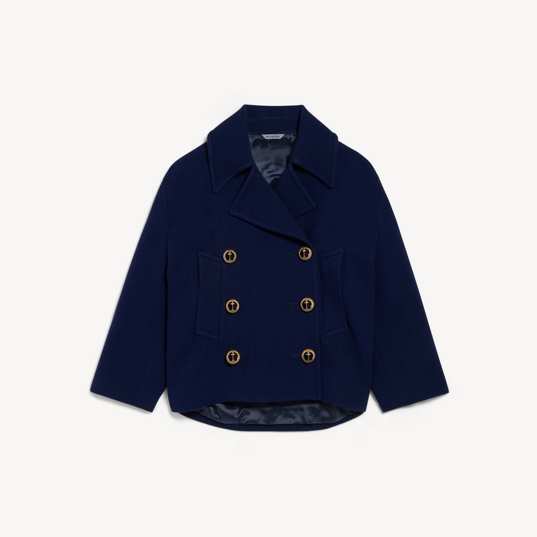 Peacoat in navy dense brushed wool is from look 42 of Balenciaga's Summer 26 Collection.