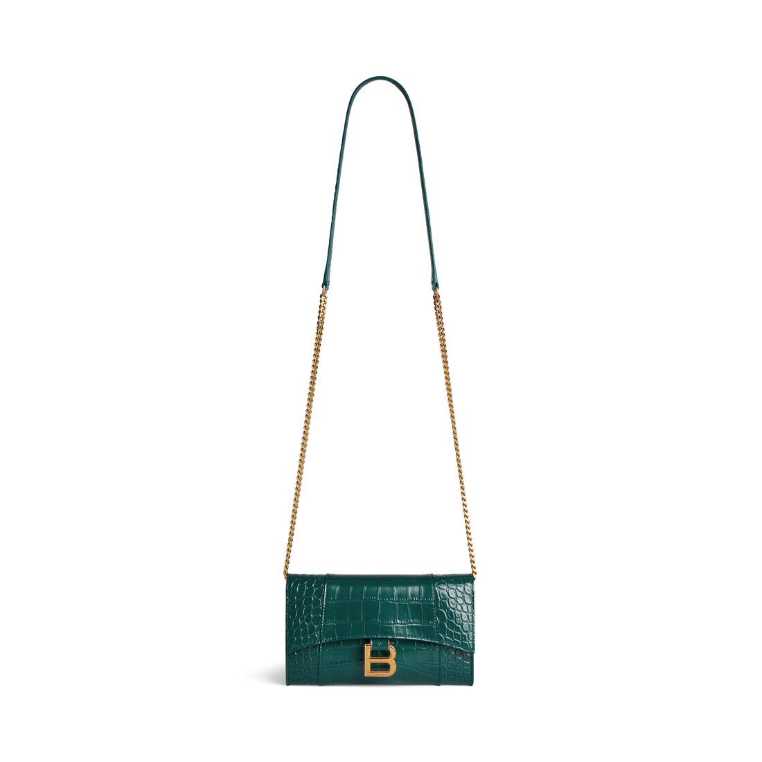 Hourglass Wallet On Chain in dark emerald soft crocodile embossed calfskin, shiny gold hardware
