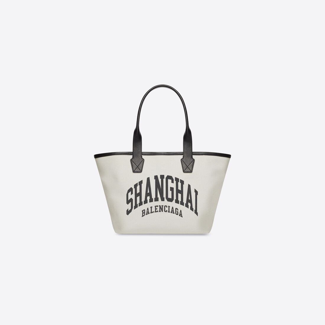 Cities Shanghai Jumbo Small Tote Bag in beige and black cotton canvas and calfskin