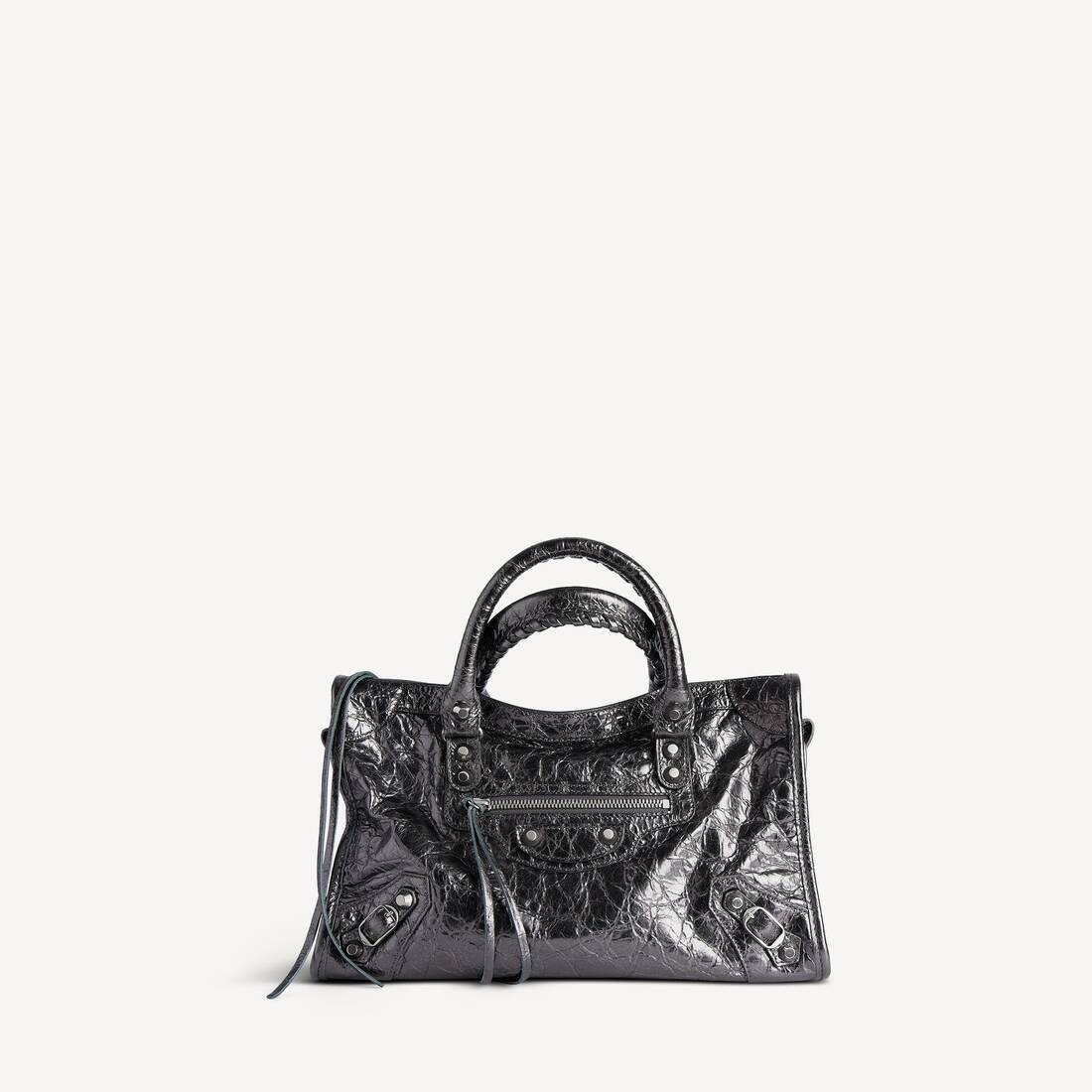 Le City Bag Small in steel grey metallized Arena lambskin, shiny silver hardware