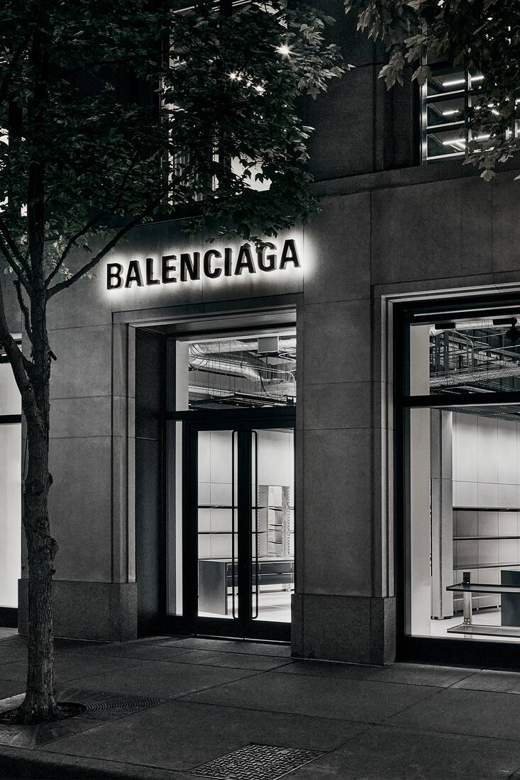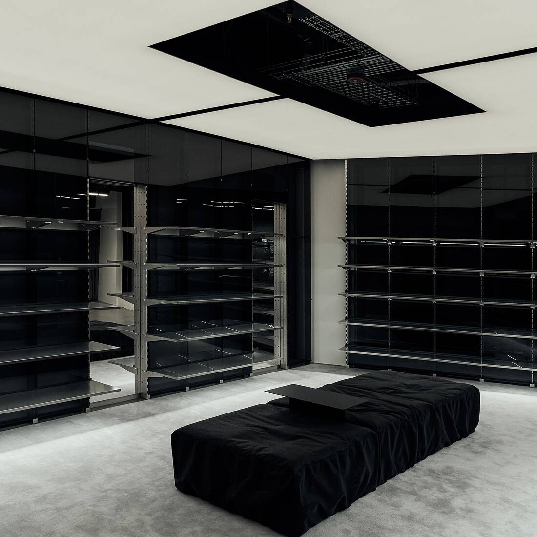 Vast brushed concrete floors resemble sidewalk tiles, while walls are made of concrete or cement board panels, creating the illusion of a liminal indoor/outdoor space. A large-scale luminous ceiling hovers over areas of congregation: the shoe section, the staircase and the fitting rooms. Elsewhere, this radiance is punctuated with suspended ceiling mesh, industrial lighting systems, and other technical fixtures. Hot rolled metal tables, angel hair-finish metal shelving, and hanging pipe racks evoke the atmosphere of a warehouse or studio. Seating throughout is upholstered in recycled leather. Panes of smoked glass, an inlaid carpet, and high-definition screens punctuate the interior with warmth and modernity.