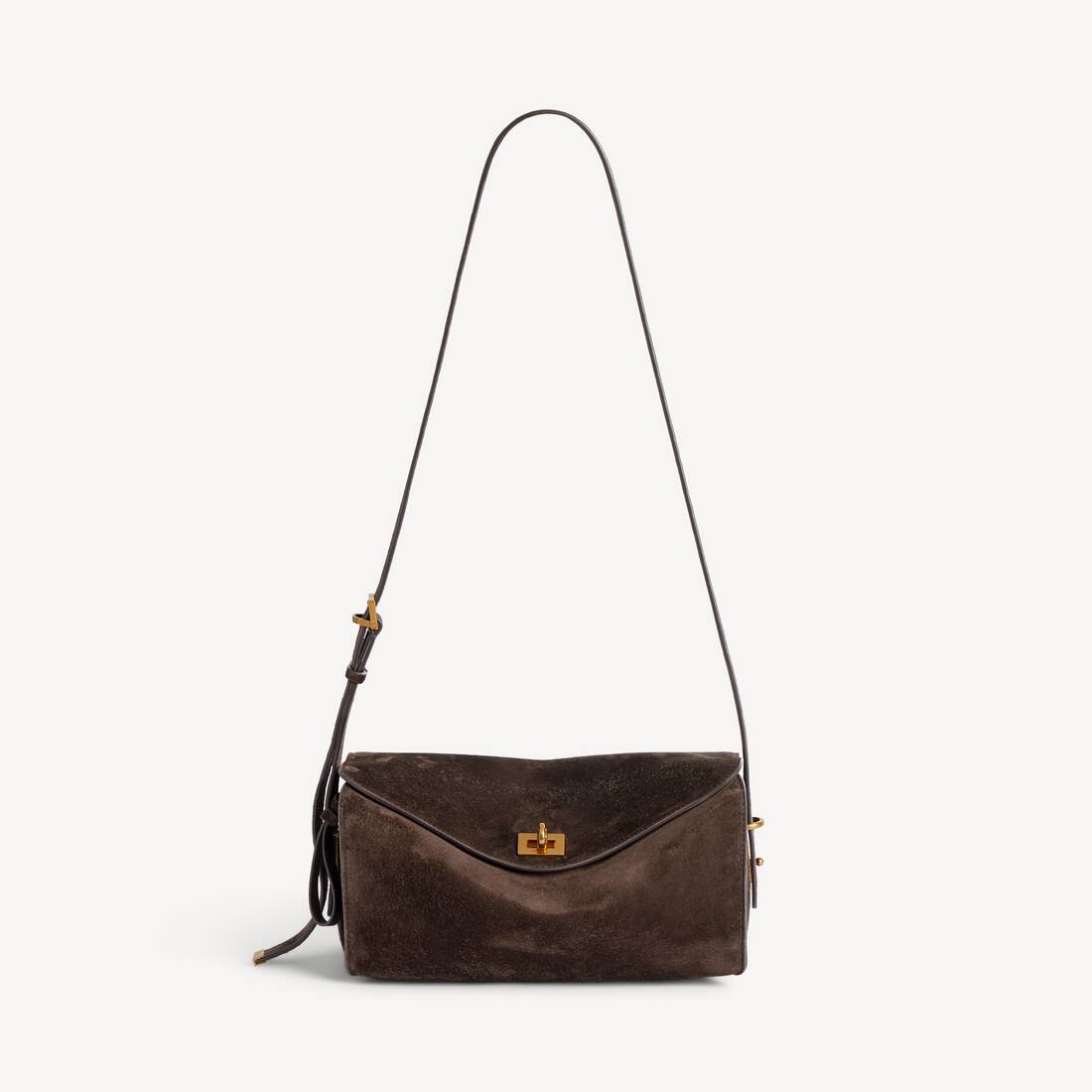 Le 7 Shoulder Bag Medium in moka suede calfskin and ruby nappa lambskin lining with aged-gold hardware is from look 24 of Balenciaga Summer 26 Collection.