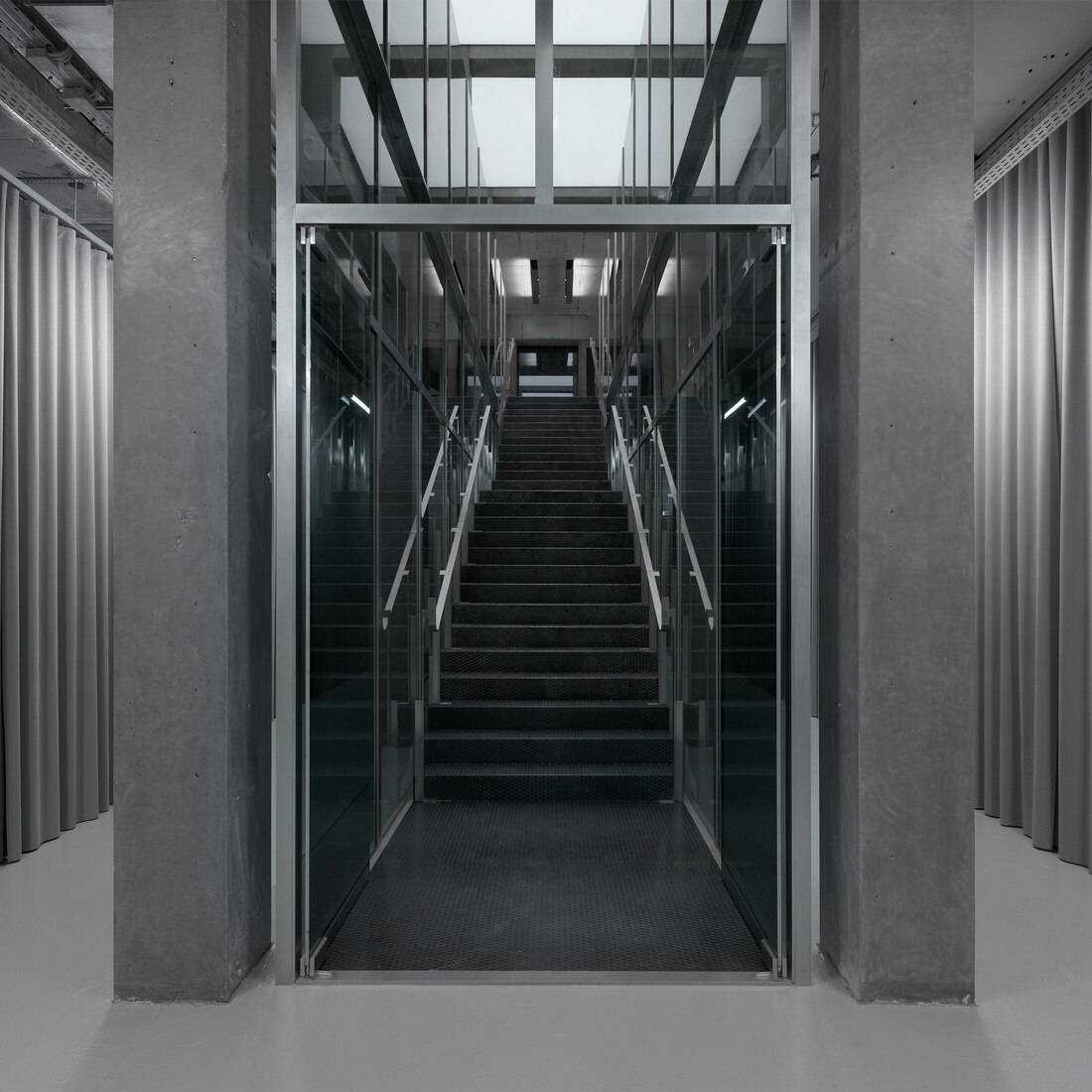 smoked glass linear staircase, positioned along the store’s central axis between a