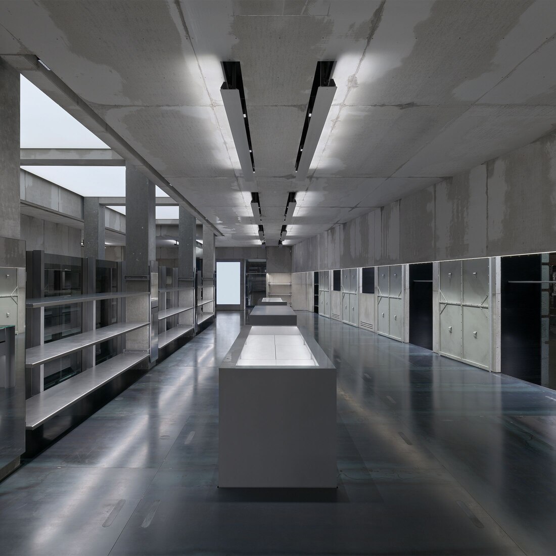 double row of columns, leads to a cavernous basement lit with an atrium-like halo.