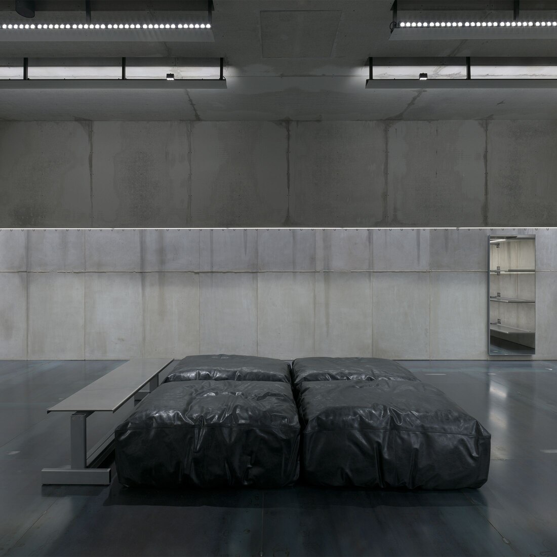 Repurposed urban steel sheets from Zurich siteworks uniformly tile the floor. A