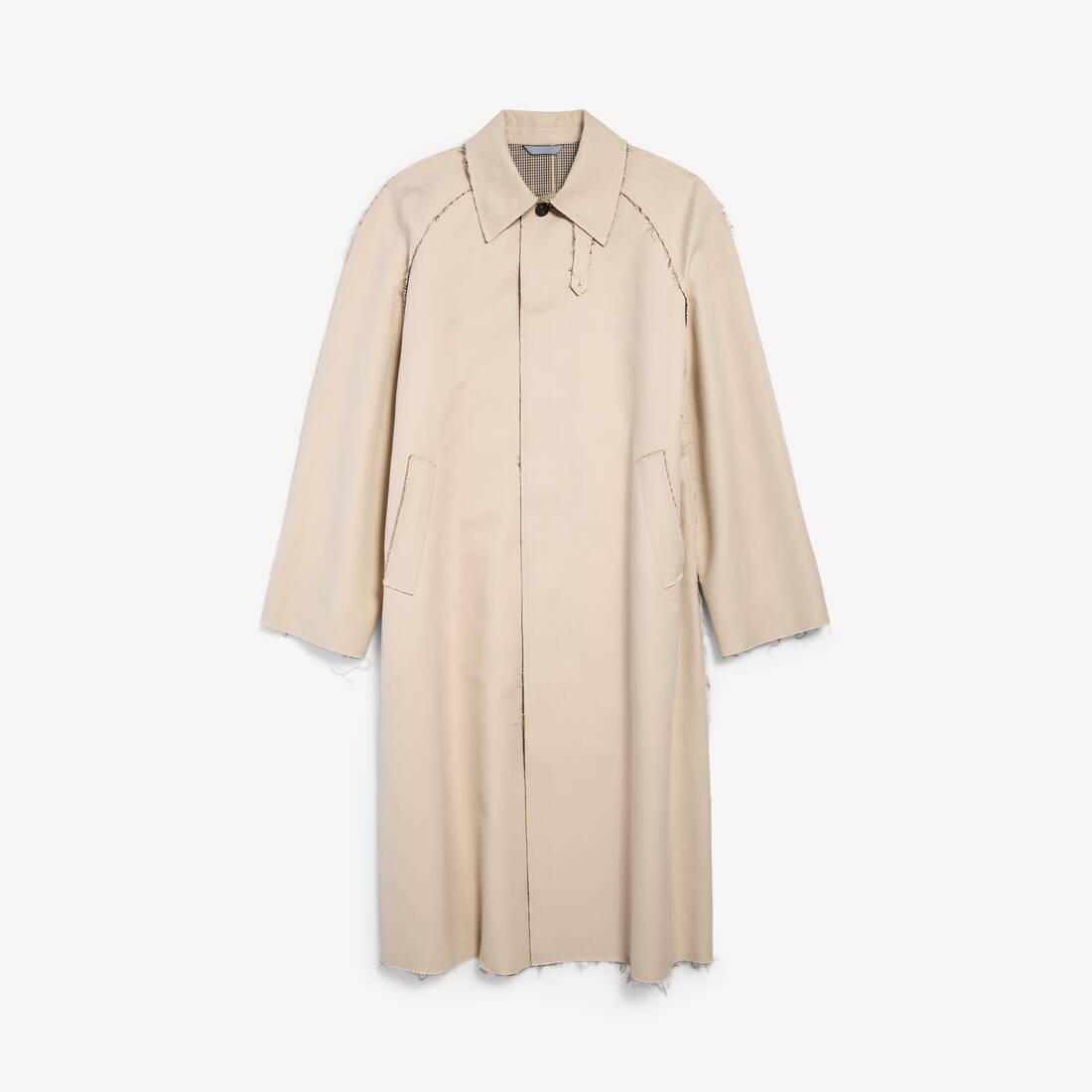 El Abrigo Corto Con Bordes Sin Rematar de algodón doble a cuadros beige aparece en el look 1 de la Colección Verano 26 de Balenciaga.