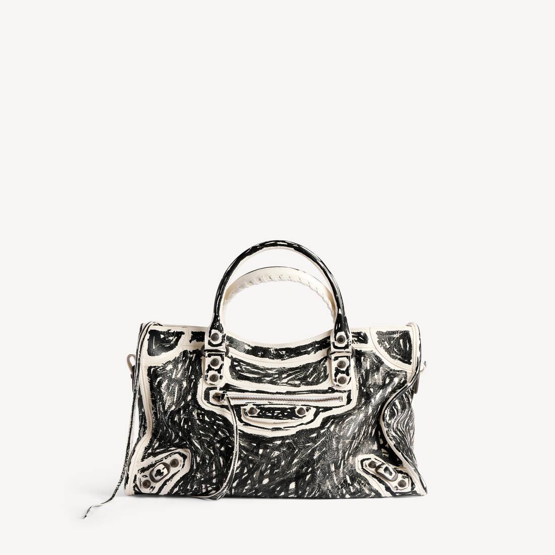 Bolso Le City Mediano de piel de cordero Arena semibrillante color nieve blanca con marcas negras estampadas, elemento de latón