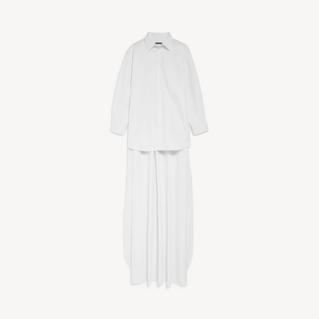 La Chemise À Traîne en organdi de coton et popeline de soie blancs est issue du look 8 de la Collection Balenciaga pour l’Été 2026.