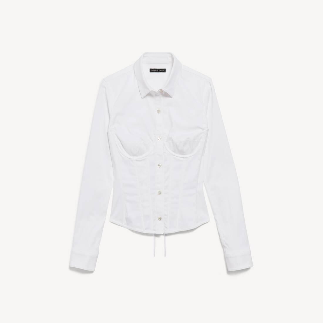 La Chemise Corsetée en popeline stretch blanche pour Femme est issue du look 12 de la Collection Balenciaga pour l'Hiver 2025.