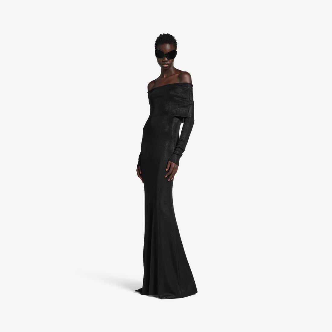 Robe Maxi Off-Shoulder en maille de viscose métallisée noire