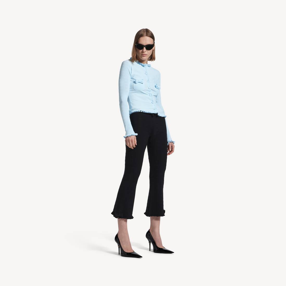 • 襟、袖口、裾にラッフル
