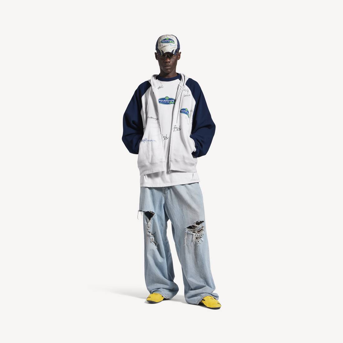 ダーティーエフェクト ホワイト/ブルー の メンズ Banana ラグラン オーバーサイズ ジップアップ Hoodie
