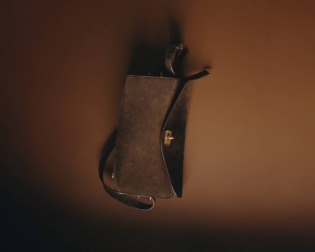 전면의 둥근 플랩은 시그니처 턴록 클로저로 여며지며, 이는 발렌시아가의 대담한 로데오 하드웨어를 확장해 해석한 디테일입니다.
