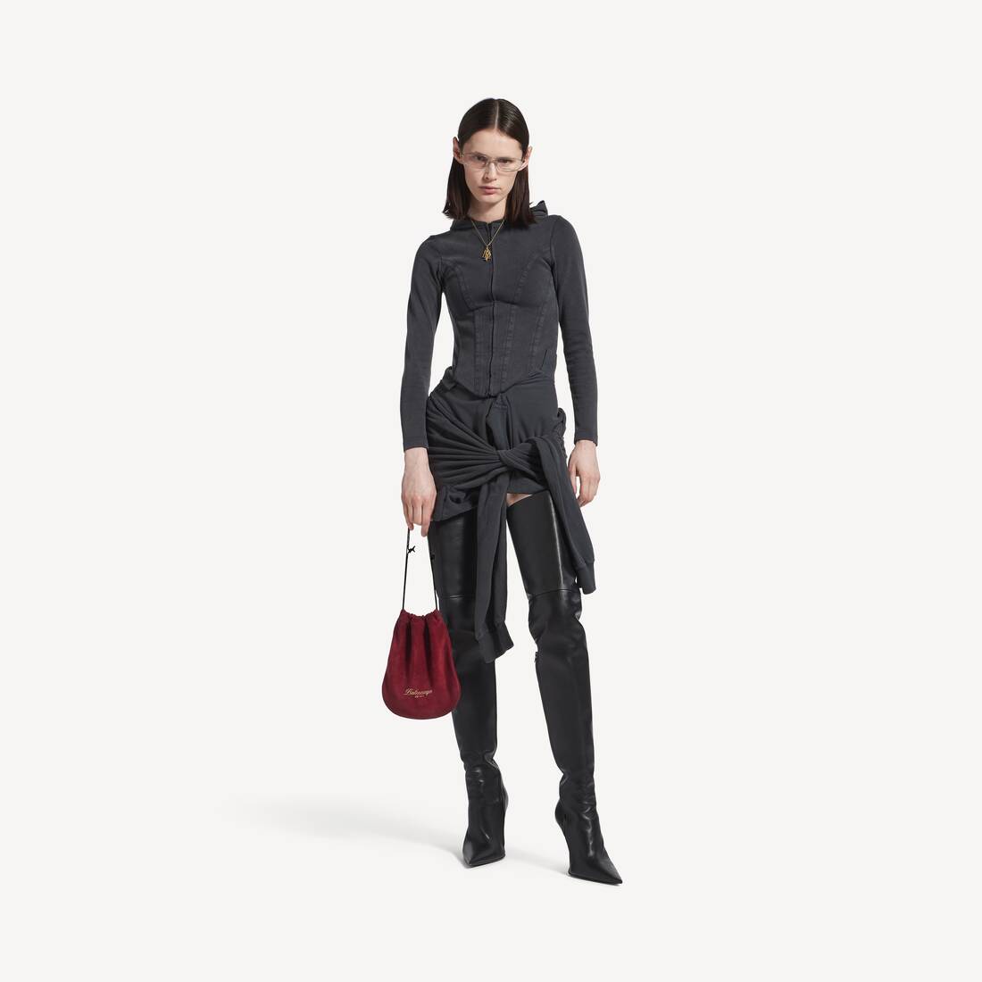워시드 블랙 인터로크 스트레치 저지 소재의 여성 코르셋 집업 후디는 발렌시아가 겨울 25 컬렉션의 49번 룩에서 선보인 제품입니다.