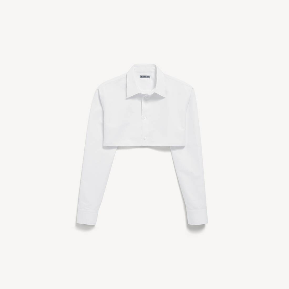 화이트 오건디 코튼 및 실크 포플린 소재의 크롭 셔츠는 발렌시아가 여름 26 컬렉션의 36번 룩에서 선보인 제품입니다.