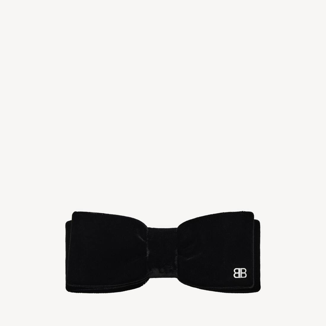 블랙 벨벳, 샤이니 실버 브라스, 스틸 소재의 홀리 헤어 보우는 발렌시아가 겨울 25 컬렉션의 59번 및 72번 룩에서 선보인 제품입니다.