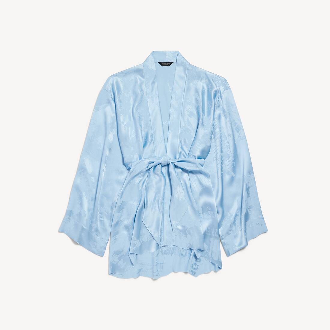 (Imposto incluído)Minivestido Wrap em jacquard de seda azul-bebê com estampa washed crayon allover