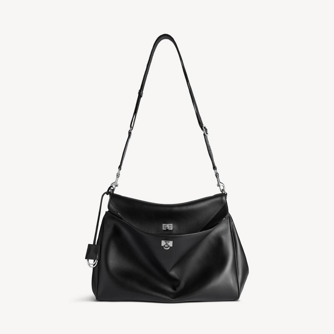 Rodeo黑色光滑牛皮革中号邮差包,饰以做旧银色金属配件